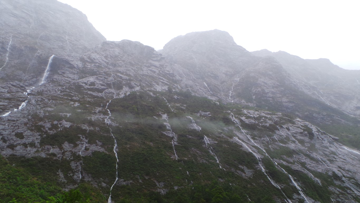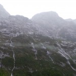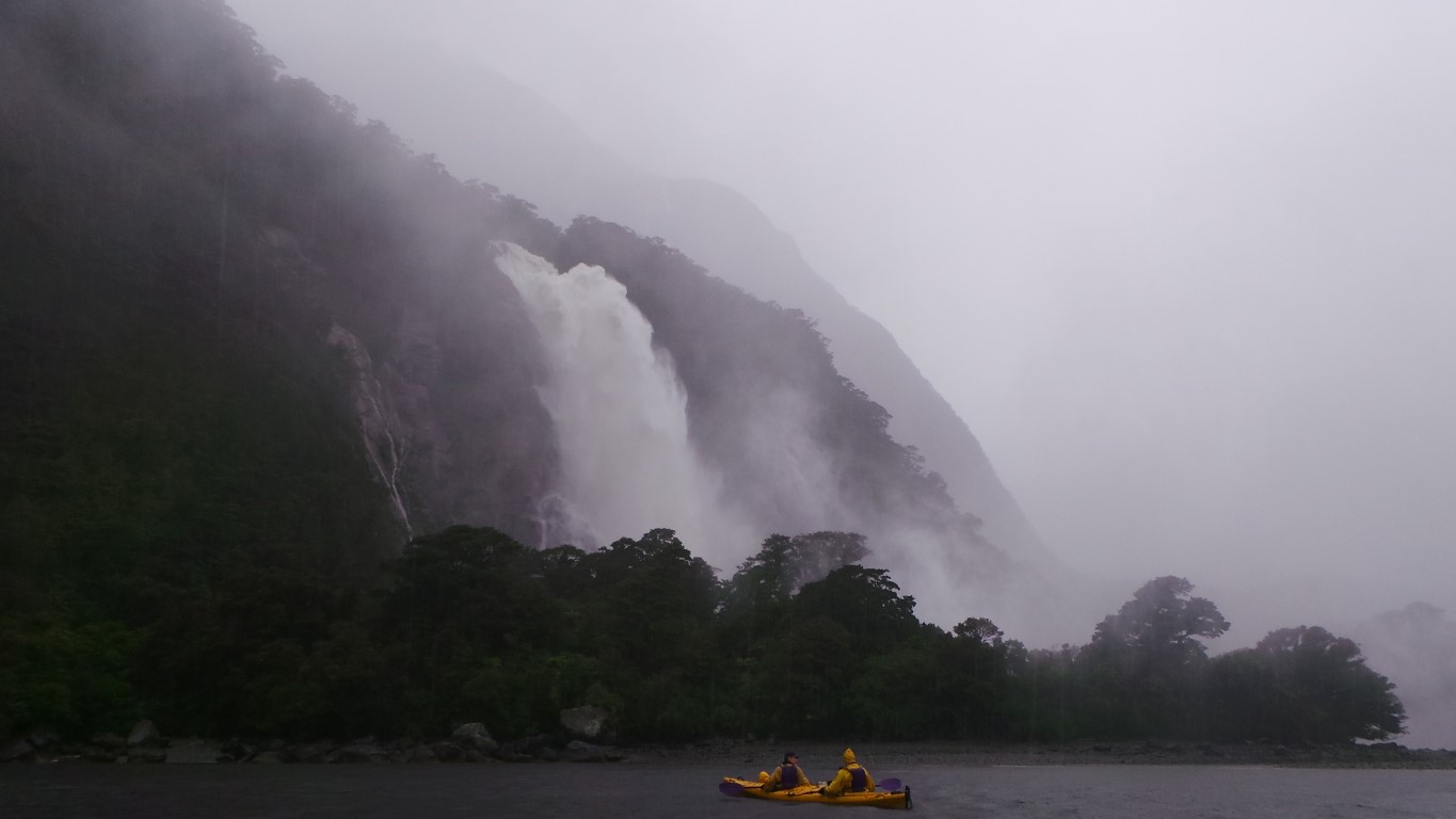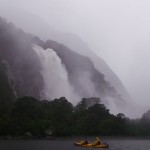 - Our tour was led by a BC Canadian named Tanner. He had an awesome attitude that kept us excited about going kayaking. We had a total of eight kayakers including Tanner. The nice thing about this company is they provide you with all you need to wear for the trip. We geared up and got into the kayaks to go around the mouth of the Milford Sound. Even though it was pouring down rain, I had an amazing time. You start to ignore the rain and realize just how beautiful this place is because of it. The mountains that were above us created thousands of waterfalls due to the rain where usually there is just two. Best times to go I’ve been told in the area – clear sky beautiful days and days like ours which were completely flooded. Thankfully we got one of them (might have chosen the sunny day option though)